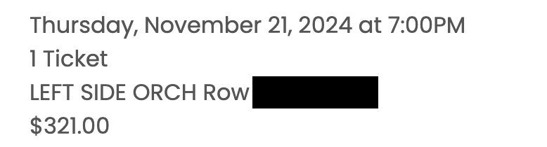 ということで、チケット代は$215.5(日本円¥34,000くらい)×3公演+$321(日本円¥45,000くらい)=$967.5(日本円で15万円くらい)になりました。
