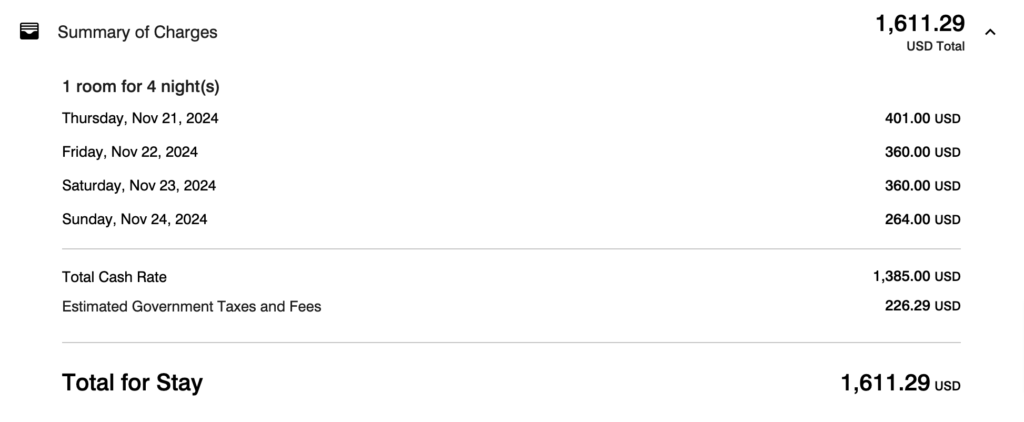 ということで、1泊は67,000ポイント+残り4泊$1,611.29(日本円で23万くらい)での宿泊となりました。(キャンセル不可の会員価格だともう少し安いんですが、何が起こるか分からないので、キャンセル可能なプランで予約しました。値段を見て、直前でキャンセル不可のプランに変更もできますんで)。