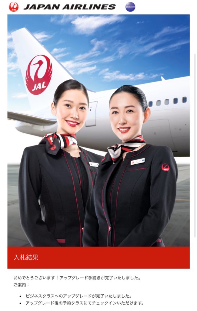 JALには入札アップデートというシステムがあるんですが、ダメもとでビジネスアップデートに入札してみました。結果は搭乗24時間以内に届くそう。(往復マイル搭乗なので、それも何か申し訳ないので、エコノミー正規平均料金分区くらいの金額で入札してみました。)