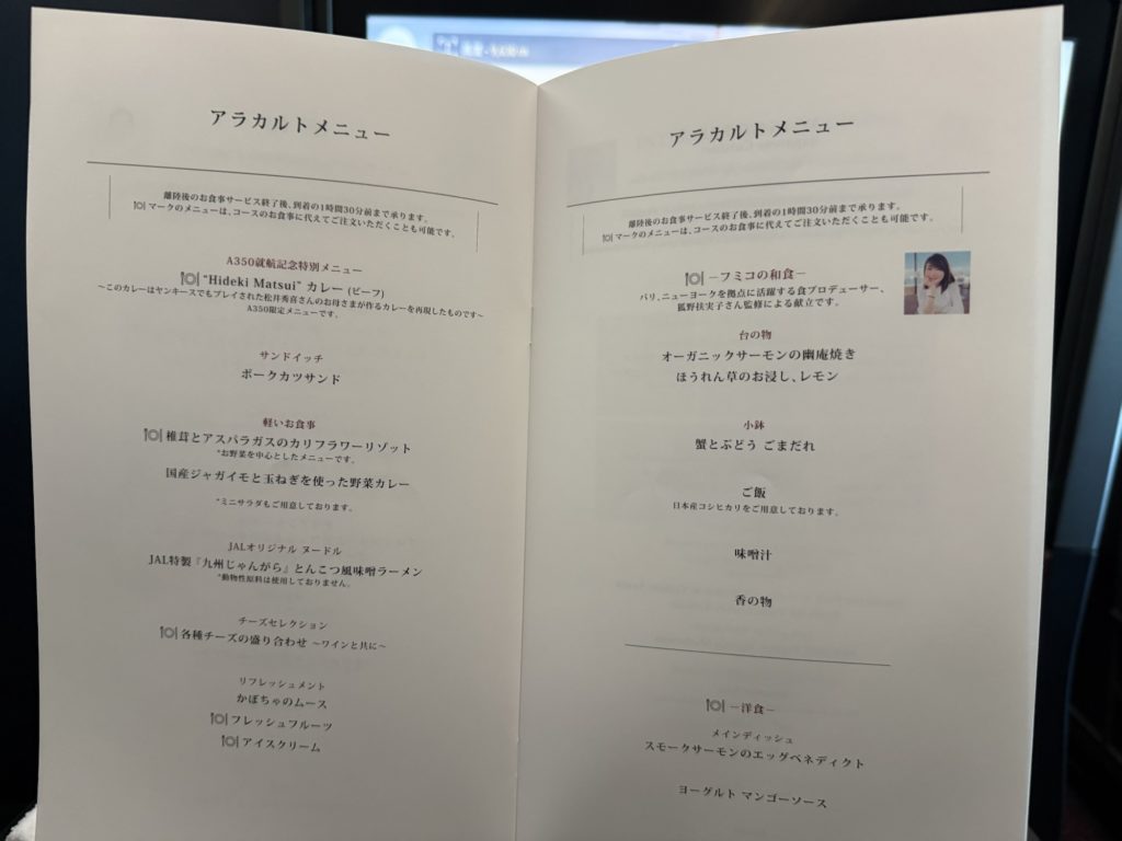サーモンいくら丼は、羽田→NY便だけなんですね。結局食べられなかった…。あと、アイスも味の選択肢がなかったです。
