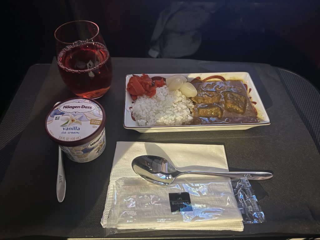 小腹が空いたので、Hideki Matsuiカレーとハーゲンダッツとスカイタイムをいただきます。(CAさんを呼んでオーダーしたら、やっぱりすぐにきました)